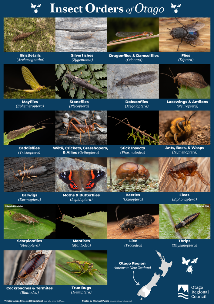 To celebrate the insect orders found in Otago, we worked with biologist Samuel Purdie to produce a poster.