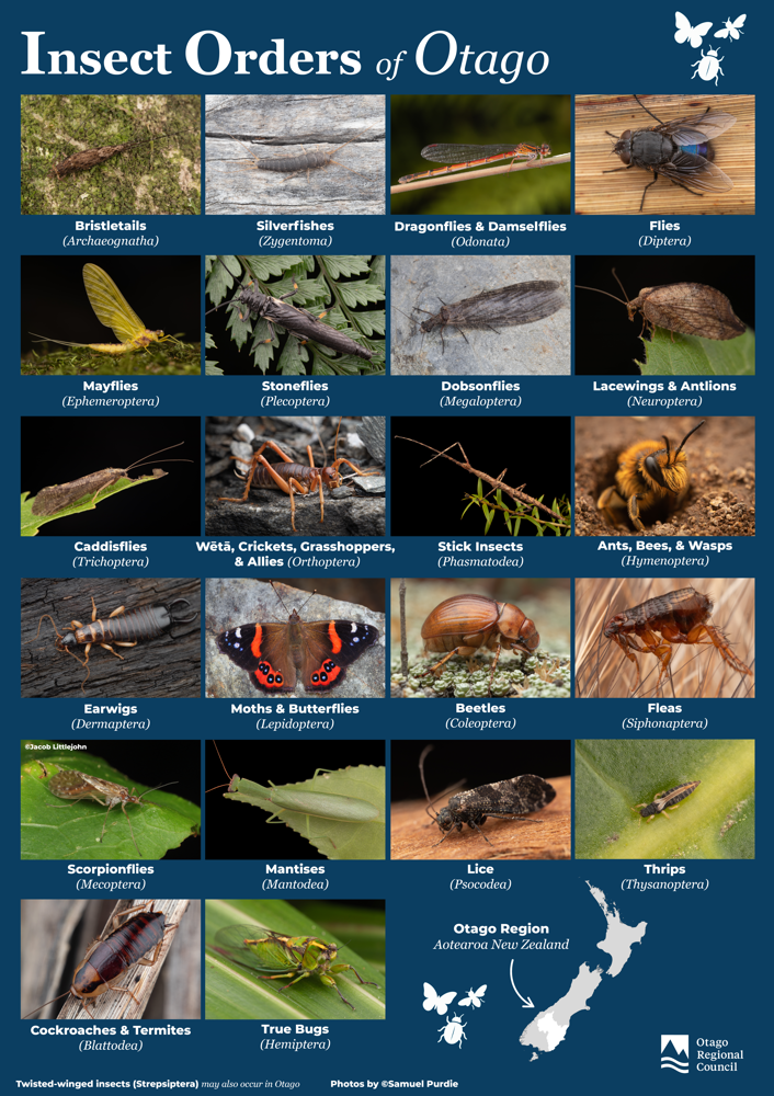 To celebrate the insect orders and many of our orthopterans found in Otago, we worked with biologist Samuel Purdie to produce posters.