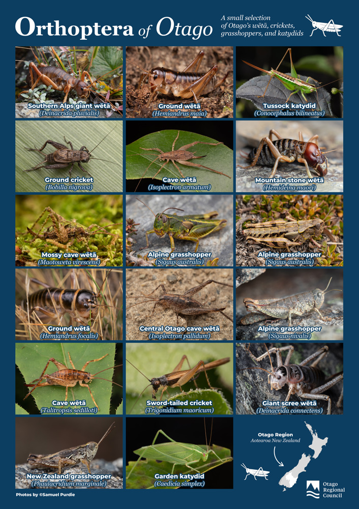 Please feel free to share these posters around, and you can download and print them out to raise awareness about Otago’s insects, including wētā, cave wētā, crickets, grasshoppers.