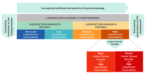 The map below shows the liquefaction hazard categorisation developed by T+T for liquefaction and lateral spreading hazards at Glenorchy. The hazard categorisation is based on New Zealand guidance from MBIE and MfE and is shown in more detail below.