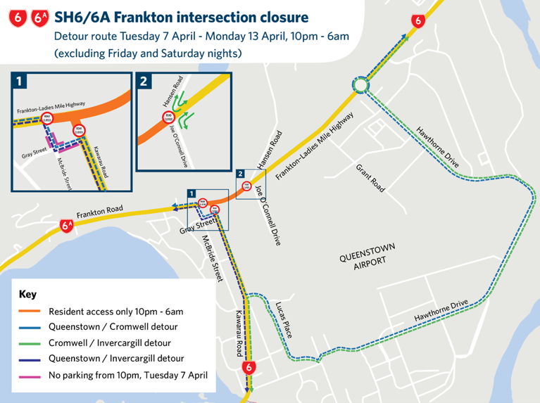 Between 10pm and 6am on the nights of 7, 8, 9, 12 and 13 April, the Frankton intersection roundabout will be closed to vehicles.