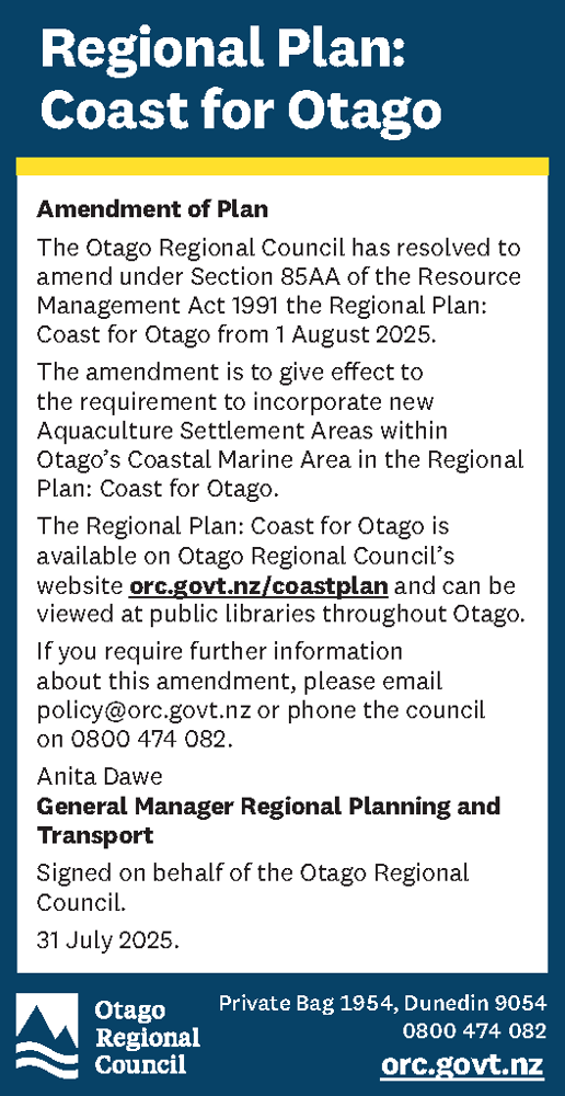 The Otago Regional Council has resolved to amend under Section 85AA of the Resource Management Act 1991 the Regional Plan: Coast for Otago from 1 August 2025.