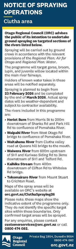 Maps of the spray areas will be available on ORC’s website at orc.govt.nz/CluthaSpraying26