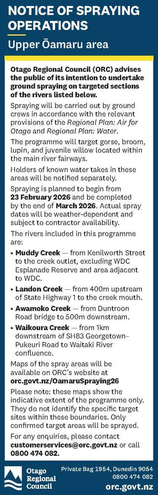 Maps of the spray areas will be available on ORC’s website at orc.govt.nz/OamaruSpraying26