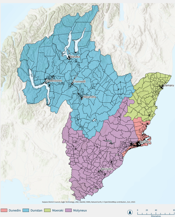 These constituencies are Dunedin (six councillors), Dunstan (three councillors), Molyneux (two councillors) and Moeraki (one councillor).