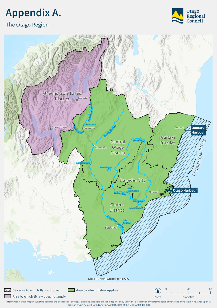 The area covered by this bylaw covers all harbours along the Otago coast, 12 nautical miles out to sea, and Lake Dunstan in Central Otago. However, the bylaw excludes Queenstown Lakes District. The QLDC has jurisdiction over all lakes and waterways in the Lakes district.