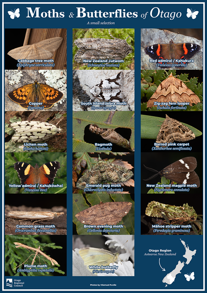 To celebrate the insect orders and many of our lepidopteran found in Otago, we worked with biologist Samuel Purdie to produce posters. Lepidopterist Carey Knox also produced a poster on brightly coloured moths of Aotearoa New Zealand; all of them are found in Otago.