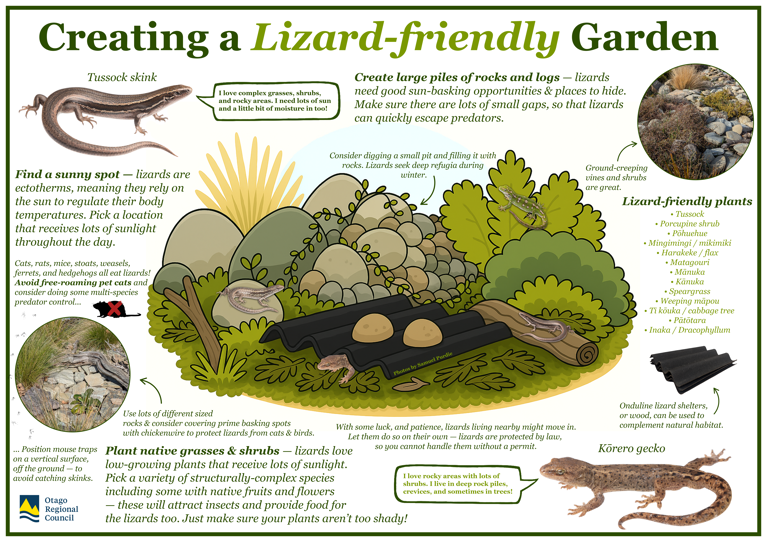Lizard-friendly gardens come in different shapes and sizes and will have differing requirements depending on the species and the region that you live in (e.g., Coastal Otago vs. Central Otago), however, these are some general tips for attracting these lizards to it. We have developed a resource on how to attract lizards to your garden and to keep them safe.