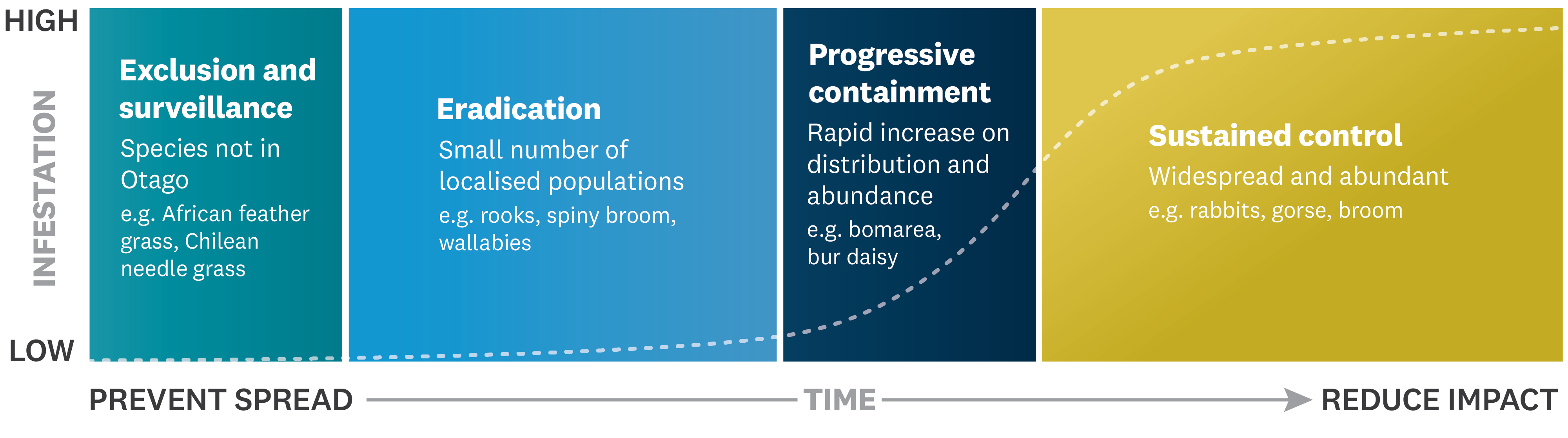 Below is an example of the pest infestation curve which is used around New Zealand to help us figure out the best management option for pests. Where a pest sits on the curve tells us the most cost-effective way to control or eradicate it.