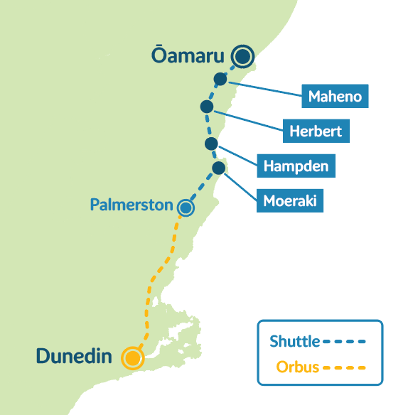 The van connects with the 11am Orbus Route 1 bus from Palmerston to Dunedin, arriving at the Dunedin Bus Hub at 12pm. It leaves the Dunedin Bus Hub at 6pm travelling to Palmerston, where the shuttle meets passengers then travels to Ōamaru, arriving about 8pm.