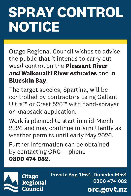 Otago Regional Council wishes to advise the public that it intends to carry out weed control on the Pleasant River and Waikouaiti River estuaries and in Blueskin Bay.